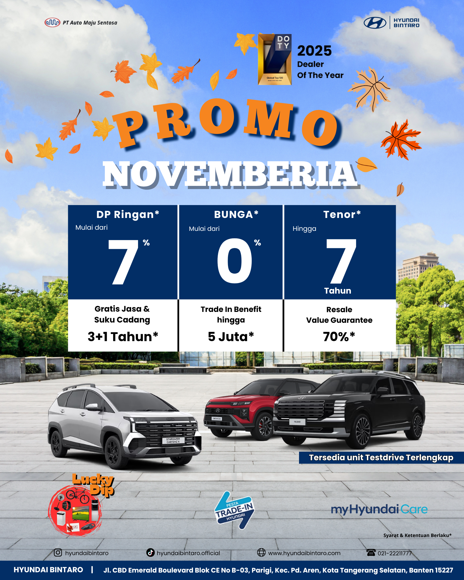 Kami dengan bangga menyambut Anda di dealer Hyundai kami. Temukan berbagai pilihan mobil Hyundai terbaru dengan teknologi canggih dan desain yang modern. Tim kami siap membantu Anda menemukan mobil impian sesuai dengan kebutuhan dan anggaran Anda. Jangan ragu untuk bertanya, kami siap memberikan informasi lengkap mengenai produk, promo, serta fasilitas layanan purna jual Hyundai.
